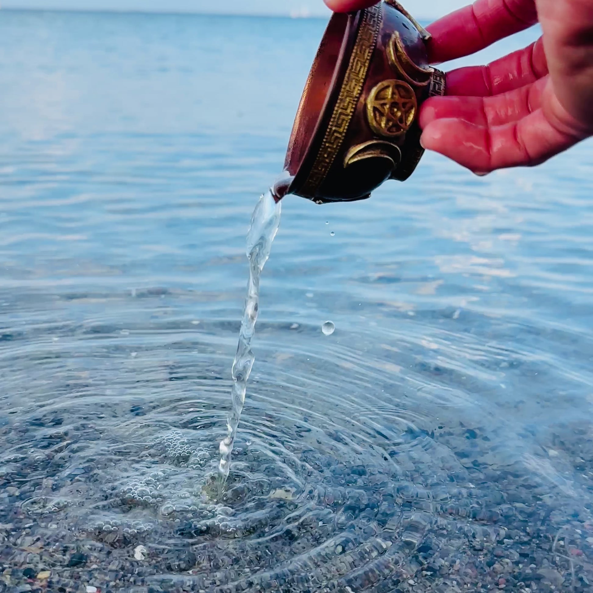 In the center of the bowl is the symbol of the triune goddess – a powerful depiction of the cycle of life through the three phases of the moon: the waxing, full and waning moon. This pentagram symbolizes the three essential aspects of the feminine divine power: youth, maturity and wisdom. Together, these symbols connect you to the deepest energies of the feminine and the cycles of nature.