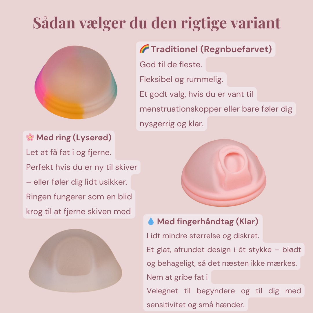 I modsætning til tamponer og kopper, placeres menstruationsskiven højt i vagina (omkring livmoderhalsen), så skeden er fri til penetration og leg – mens blodet bliver holdt sikkert tilbage.