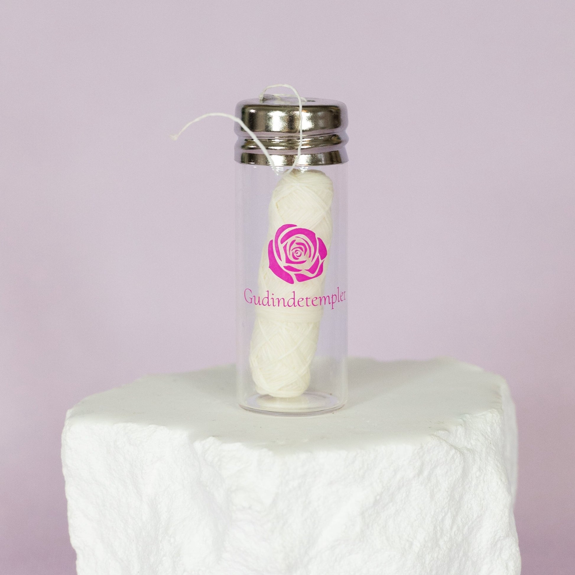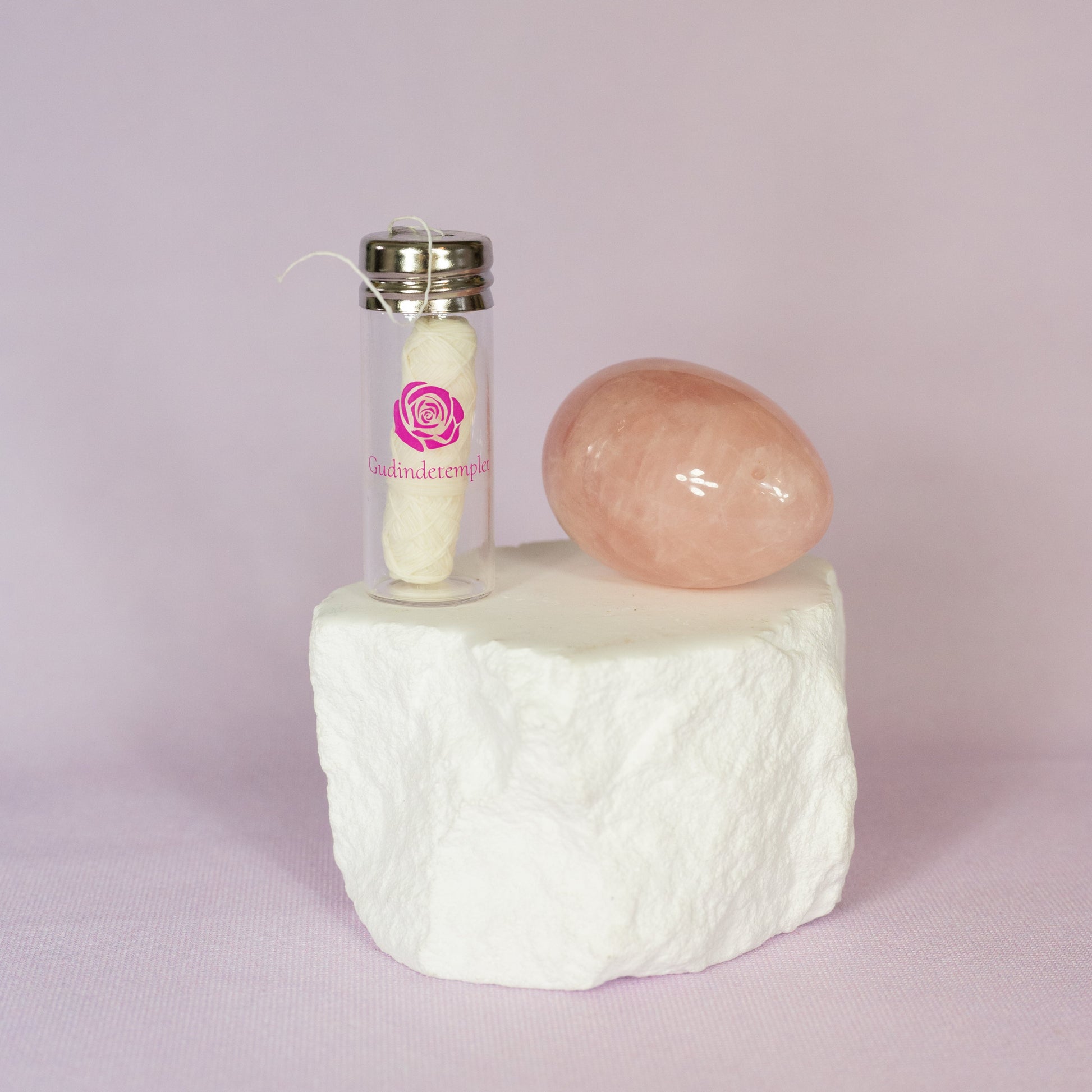 The string is 30 cm. and will be able to be used for many yoni egg practices. You tie the string on the egg for safe removal and for advanced egg exercises, where you pull the string or tie a weight on. You can choose to throw the string away after use and tie a new one on for the next practice, BUT you can also choose to reuse it up to three times by washing it. It can be thrown in the compost, as it is biodegradable.